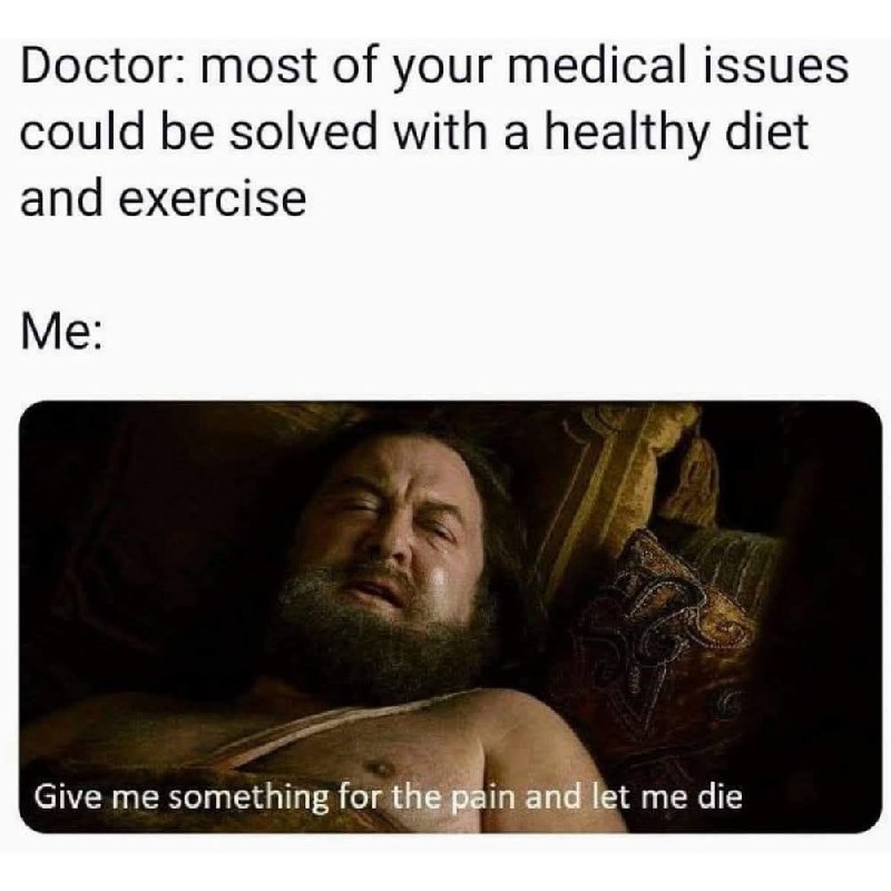 Doctor: most of your medical issues could be solved with a healthy diet and exercise. Me: Give me something for the pain and let me die. #mood.