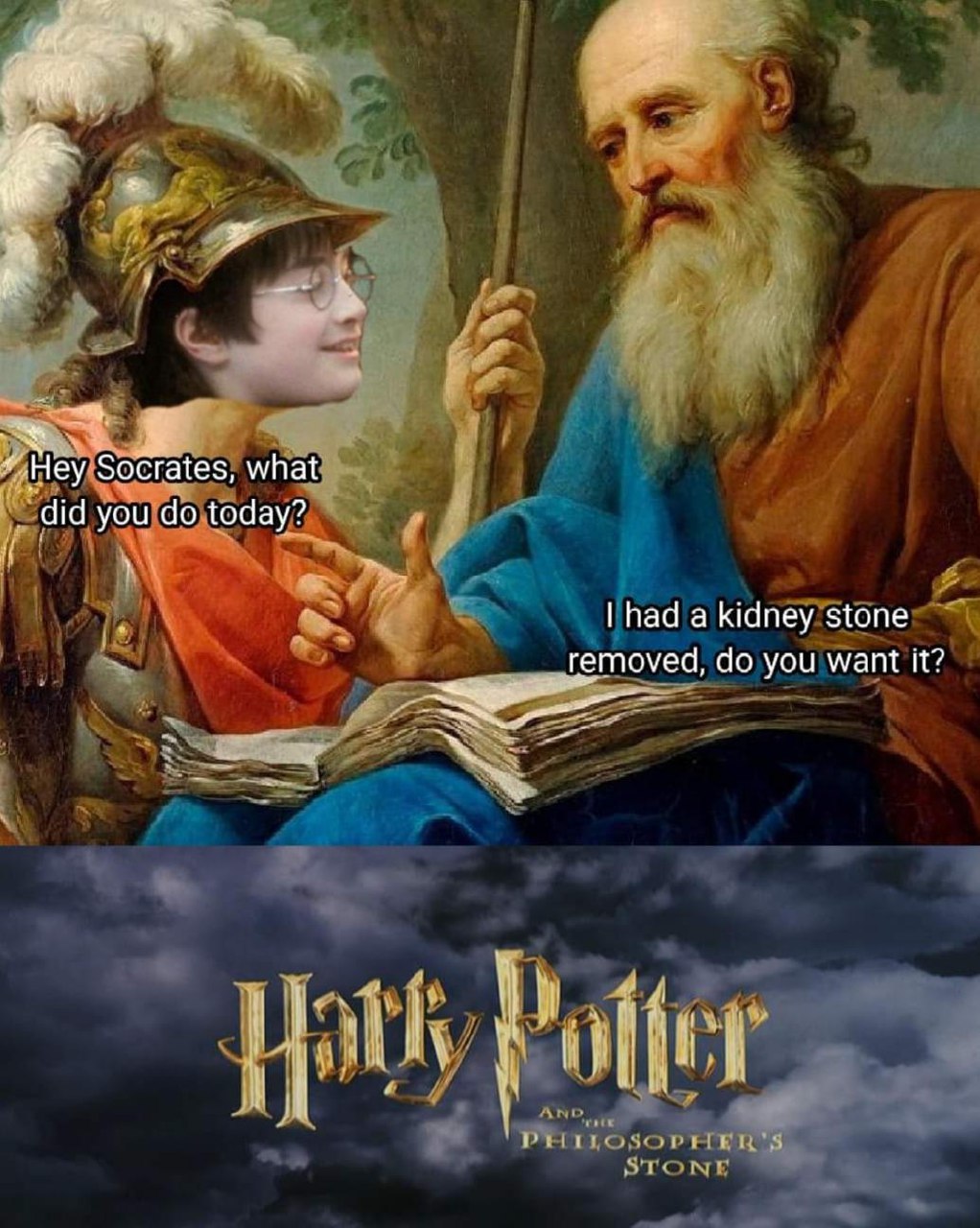 Harry Potter: “Hey Socrates, what did you do today?” Socrates: “I had a kidney stone removed, do you want it?” #philosophy #wtf.