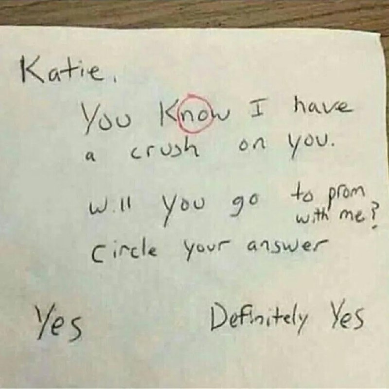 Katie, you know I have a crush on you. Will you go to prom with me? Circle your answer: Yes or Definitely Yes. #Crush #Prom.