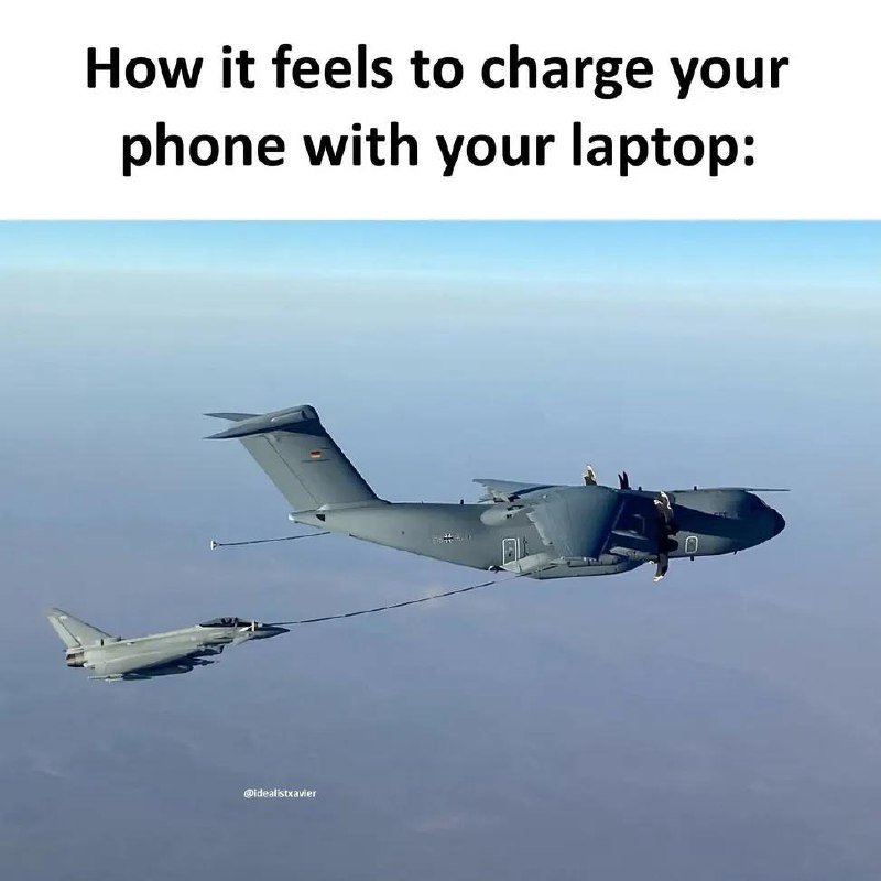 Military refuel jet fuels smaller jet mid-air, caption: How it feels to charge your phone with your laptop. #relatable #tech.