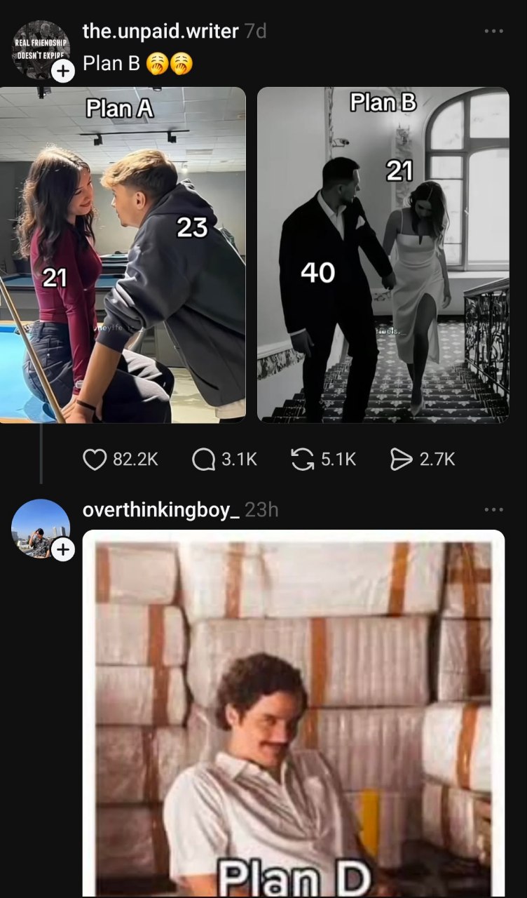Plan A: 21 & 23. Plan B: 21 & 40. When both flop, there’s always Plan D—a smirk is forever. #dating #choices.
