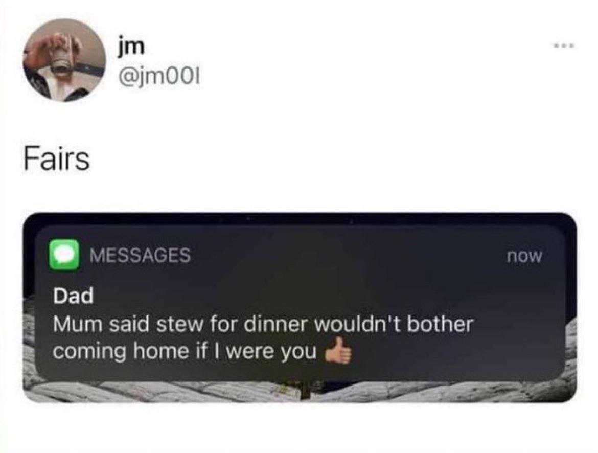 When dad texts: “Mum said stew for dinner wouldn’t bother coming home if I were you” š Caption: Fairs. #FamilyDrama #StewNight.