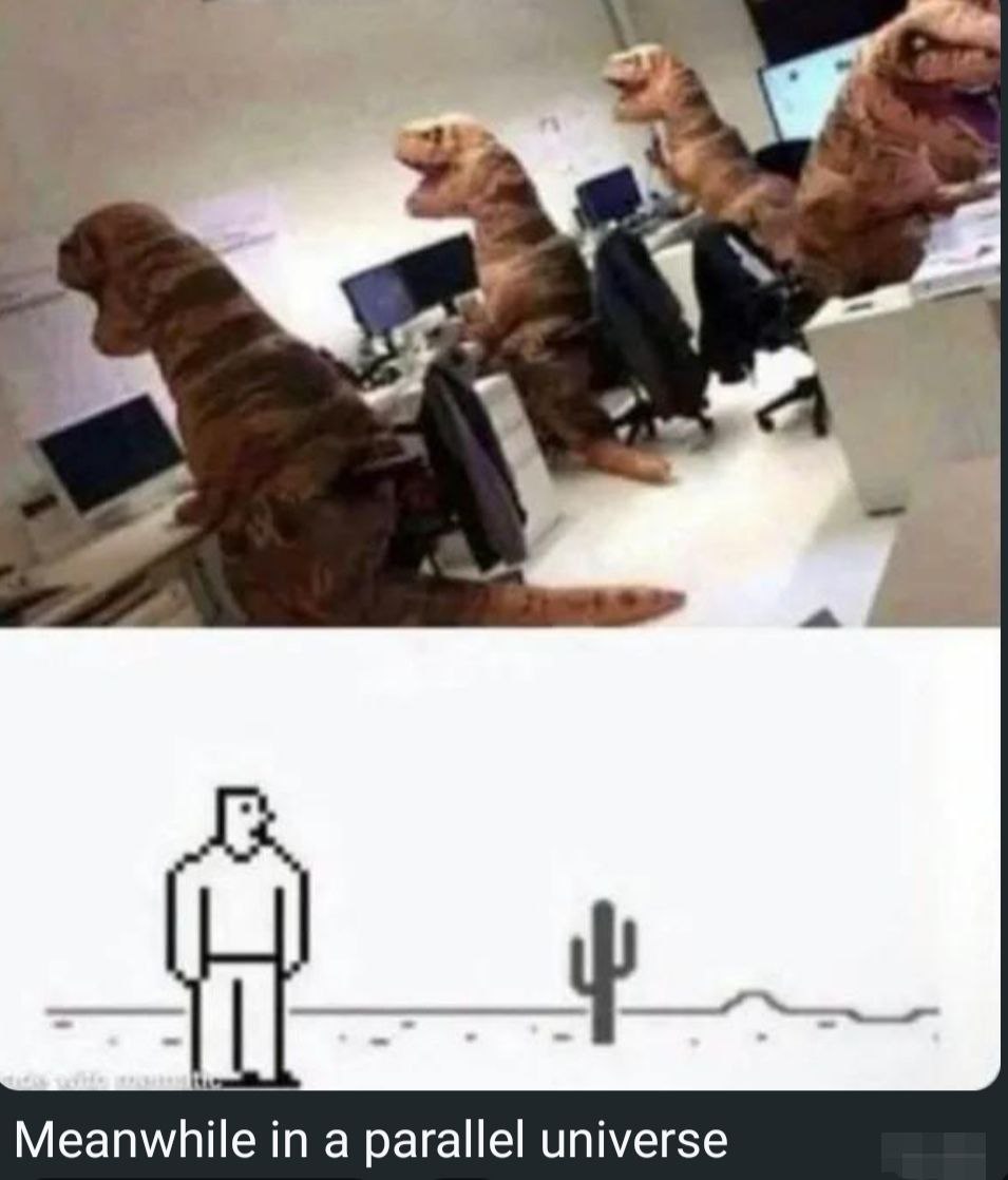 When the boss says “let’s circle back after the meteor,” and you realize meetings never go extinct. #Monday #office #dinosaur.