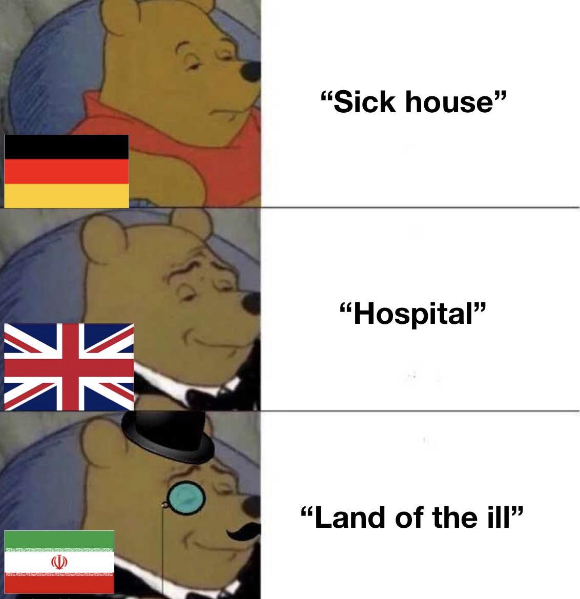 When you realize Germans call it “Sick house,” English just says “Hospital,” and Persians go for “Land of the Ill.” #language #meme.
