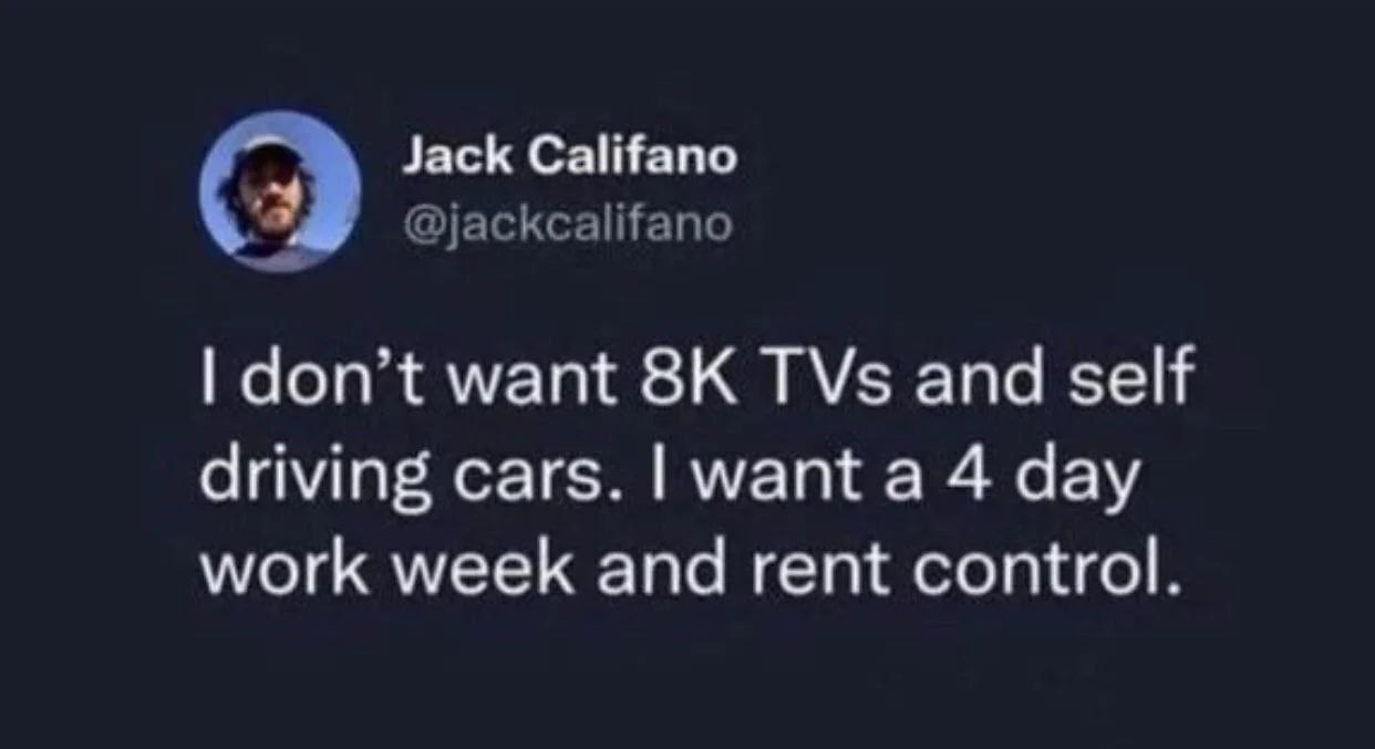 You don’t want 8K TVs or self-driving cars. You want a 4-day workweek and rent control. You just said it. #priorities #adulting.